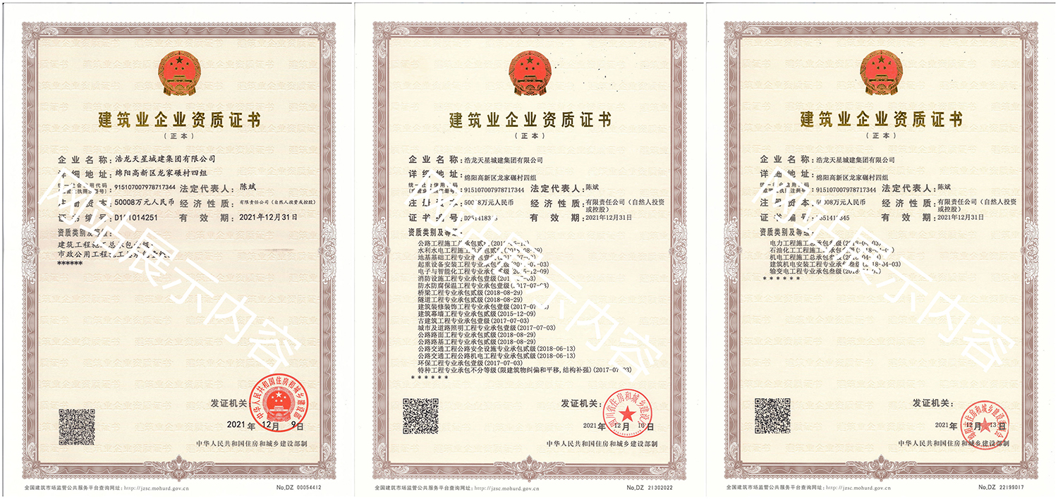 浩龍?zhí)煨浅墙瘓F有限公司,2007年成立于“李白故鄉(xiāng)、中國科技城”—四川省綿陽市,企業(yè)注冊資本金5.0008億元。公司共有27項建筑業(yè)企業(yè)資質(zhì),其中國家一級資質(zhì)11項,二級資質(zhì)10項,三級資質(zhì)5項,特種資質(zhì)不分等級1項,類別涵蓋建筑、市政、水利、機電、隧道、起重設備安裝等基礎及未來發(fā)展重點專業(yè)。公司...